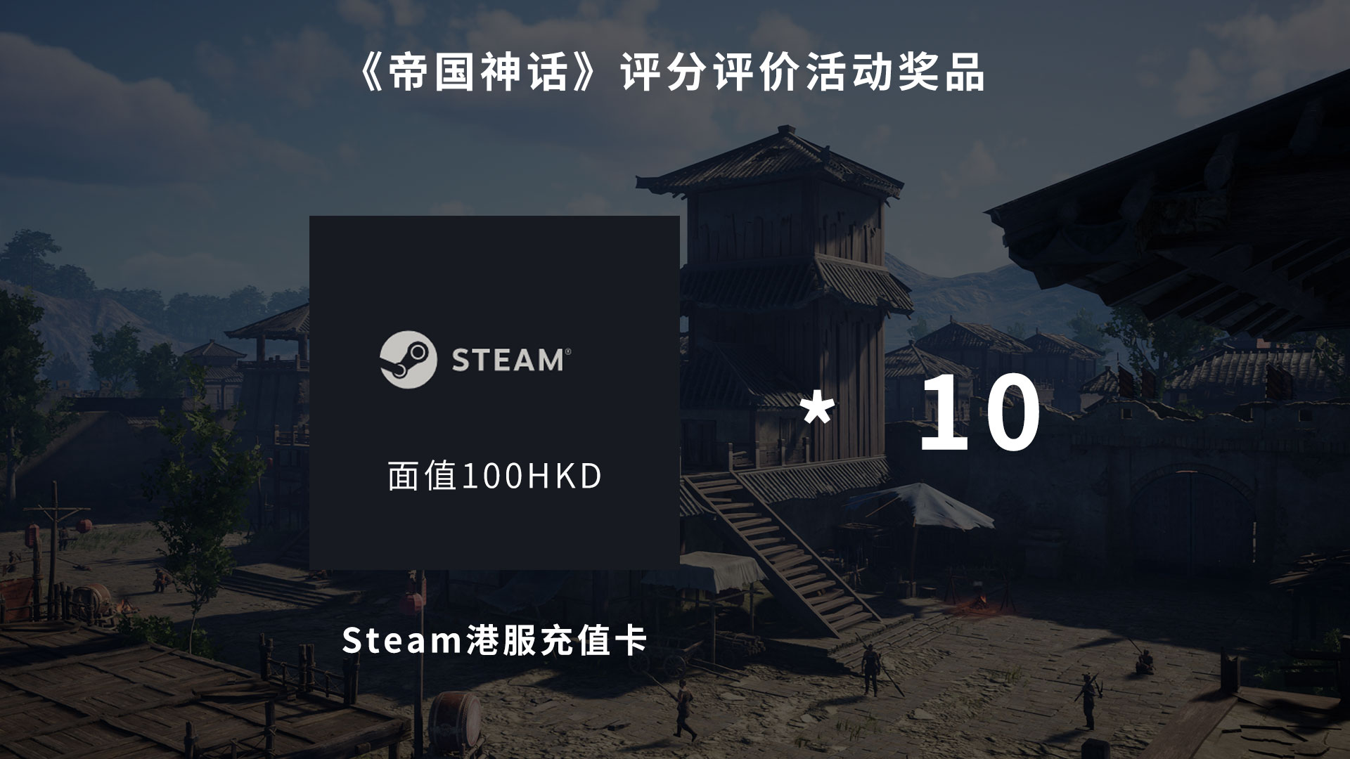 【参与战争沙盒网游《帝国神话》评分评价活动抽10张Steam 100港币充值卡】《帝国神话》自从11月18日登陆Steam进行抢先测试以来,便受到了许多喜欢战争、沙盒、生存等类型玩家的热烈关注,浓郁的古代东方色彩、数百种冷兵器的史诗战场,颇具养成的PVE玩法以及呼朋唤友一起攻城掠地的PVP模式,都让这款国产游戏增色不少。不知道正在体验此款游戏的柄友们你对游戏评价如何?你是喜欢PVE还是PVP模式?你觉得游戏系统有哪些亮点?欢迎大家在《帝国神话》详情页写下自己的游玩体验,我们将从所有发表评分+评价中挑选10名赠送Steam 100港币充值卡。