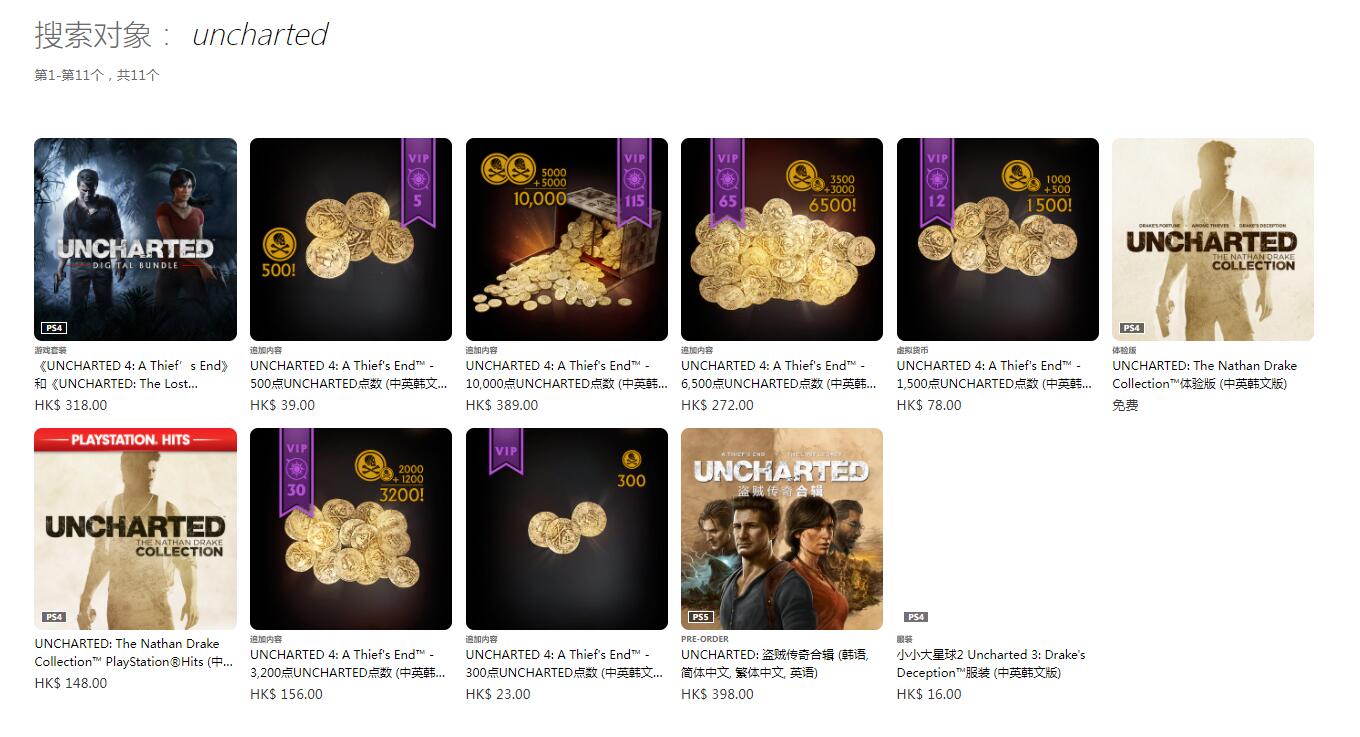 【PS4《神秘海域4》《神秘海域:失落的遗产》单独版本已下架】索尼在昨晚公布了《神秘海域:盗贼传奇合集》将于2022年1月28日率先登陆PS5平台,2022年内登陆PC平台;该合集将收录《神秘海域4:盗贼末路》与《神秘海域:失落遗产》两款作品的重制版(Remastered),已拥有《神秘海域4:盗贼末路》、《神秘海域:失落遗产》或是两者合集数字版的玩家,可以花费10美元/80港币升级至PS5《神秘海域:盗贼传奇合集》数字版。然而据VGC报道,目前索尼已从PSN商店下架了PS4单独版的《神秘海域4:盗贼末路》、《神秘海域:失落遗产》,仅还保留了两者合集的数字版。随后我们也前往PSN HK商店搜索进行了验证,发现的确目前仅能搜索到两者合集的数字版。