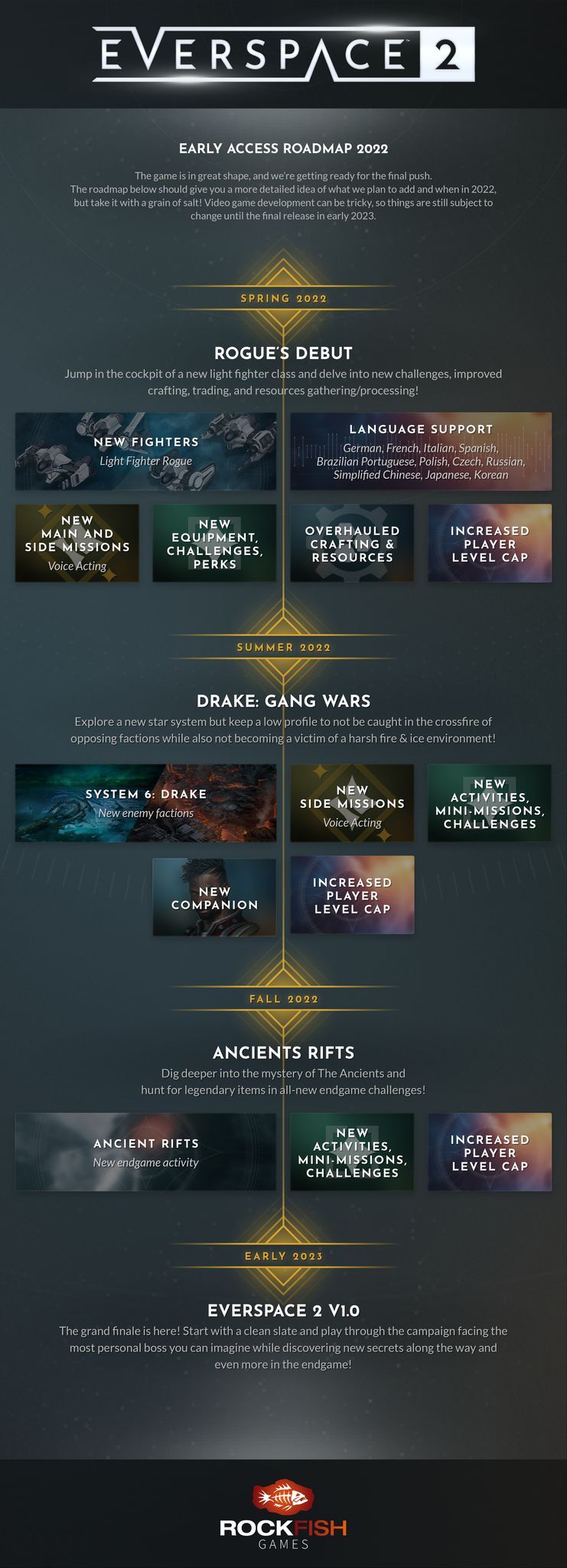【《永恒空间2》将于2022年春季加入中文支持】开放世界太空射击游戏《永恒空间2》近日放出了2022年的更新计划,首个更新就是在明年春季将引入的新飞船“rogue”,还将增加新的装备,任务和奖励,同时游戏还将改进资源收集系统,并增加多人游戏玩家上限;此外届时还将更新加入包括简体中文在内的多种语言支持。第二个大更新是在2022年夏季,添加了玩家最喜爱的派系系统,新的活动,同伴和更多剧情任务也将到来。最后一个大更新是在夏季,玩家可以进入宇宙裂痕中获得传奇装备奖励,同时可以游玩更多新活动和迷你任务。最后游戏将于2023年更新1.0版本,加入神秘新boos和结局,届时也将上架主机平台。(PS:《永恒空间2》被视为“浴火银河”精神续作,因为当年正是由ROCKFISH Games团队成员打造了“浴火银河”系列)