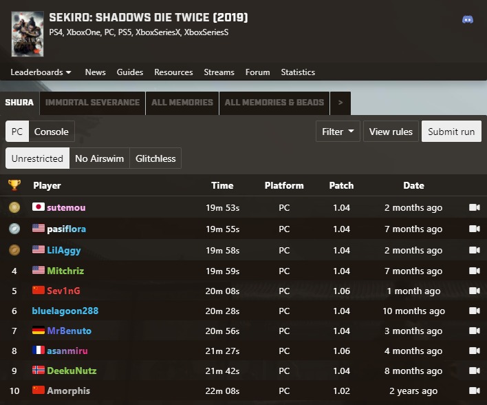 【世界最大级速通大会“AGDQ2022”今日打响,蒙眼《只狼》将压轴登场】世界最大级的速通大会“AGDQ2022”已于今日正式打响,本次活动会在为期7天的时间里为全球玩家献上140多款游戏的精彩速通表演。除了一些复古经典作品外,PS5的《死亡循环》《仁王2》应为活动中的热点节目。而在最后一天(北京时间上午7点)蒙眼《只狼》速通挑战将作为压轴登场。参加挑战的是美国玩家Mitchriz(速通记录19分59秒,目前排世界第四,第一位是来自日本的玩家sutemou19分53秒,数据来源: speedrun),他曾在去年夏季发布过蒙眼通关《只狼》的视频,当时用时4小时30分,不过在12月份他就以1小时52分的成绩更新了纪录。本次大会的预设时间为2小时45分,在期间内完成就算挑战成功!