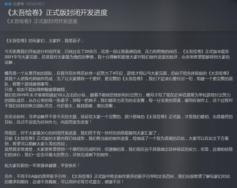 《太吾绘卷》官方更新正式版封闭开发进度文章