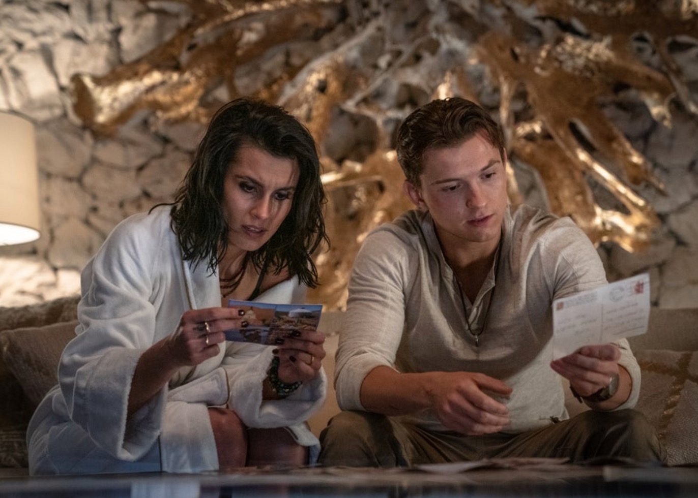 【《神秘海域》电影公开新海报及剧照】 “内森・德雷克”在最新的《神秘海域》电影海报中回归,同时也带来了一些新的剧照。 “荷兰弟”扮演的德雷克出现在这张最新海报的C位,与他一同上镜的还有老伙伴苏利(由马克・沃尔伯格扮演)。除此之外,索菲亚・阿里扮演的克洛伊,塔蒂·加布里埃饰演的布拉多克,以及安东尼奥·班德拉斯扮演的本作中的反派角色也已出现在了海报中。 一些新剧照也给我们展示了影片的更多内容,不过可惜的是苏利标志性的大胡子并没有出现在这批照片里。本片的剧本由雷夫·贾金斯,阿特·马库姆和马特・霍洛威共同执笔,将是这部PS第一方经典作品的荧幕首秀。