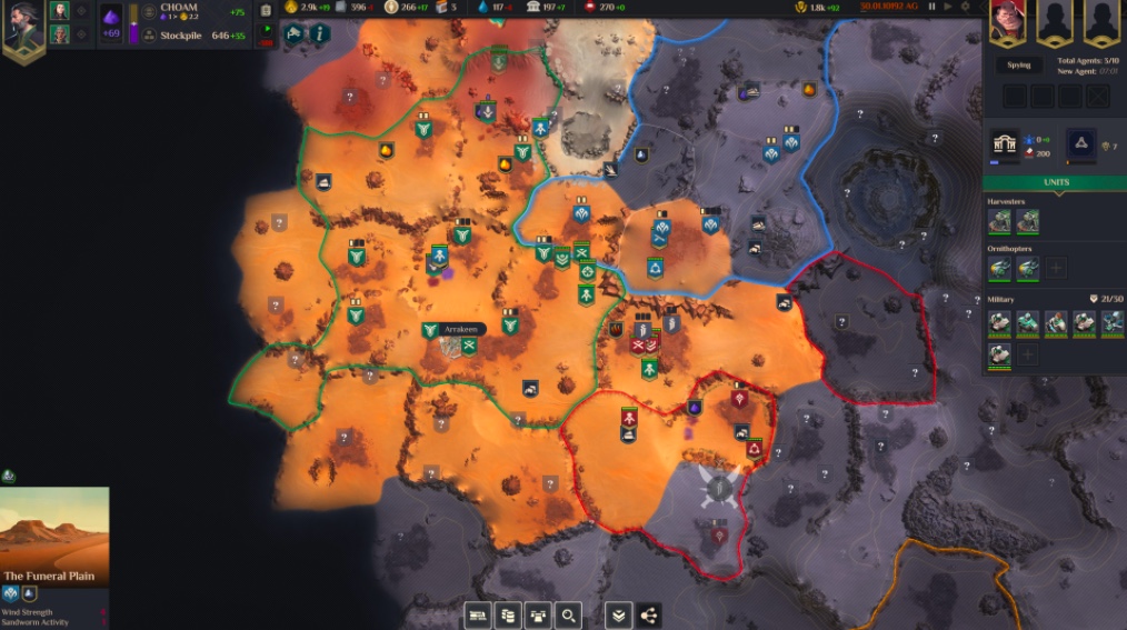 【《沙丘:香料战争》公布游戏细节以及早期发行计划】《沙丘:香料战争》是一款基于弗兰克赫伯特标志性科幻小说《沙丘》的即时战略游戏。游戏开发商Shiro Games明确表示,这是一款即时战略游戏和4X游戏。《沙丘:香料战争》将具有慢节奏的RTS游戏特色,包括暂停和快进的能力。此外,它专注于4X领域中的探索、领土控制、经济运营和战斗。尽管如此,Shiro Games表示4X元素不会减损《沙丘:香料战争》的RTS游戏体验。虽然沙丘:香料战争将允许玩家建立行动基地,但它不会以建筑布局为特色。其特点是比典型的 RTS 具有“更大的规模”。可以说,厄拉科斯星球非常大,玩家所管理的领土将比大多数 RTS 游戏的范围要大得多。至于《沙丘:香料战争》将如何发布,官方计划使用抢先体验模式,目前游戏已经在Steam上架页面,预计将于2022年推出。