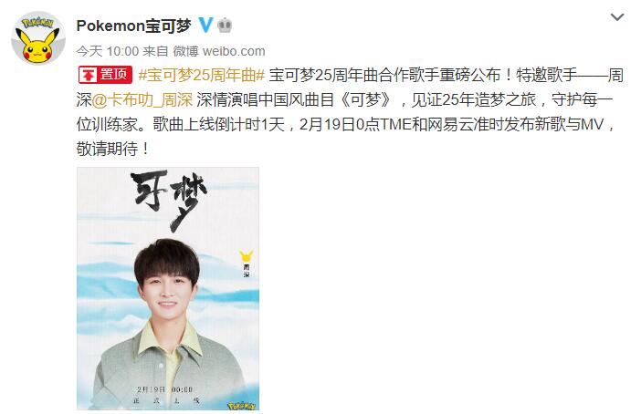 【宝可梦25周年曲合作歌手公布,周深将演唱中国风曲目《可梦》】Pokemon宝可梦官方微博公布了宝可梦25周年曲合作歌手,将由歌手周深演唱中国风曲目《可梦》,届时歌曲与MV将于2月19日0点在TME和网易云发布。