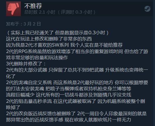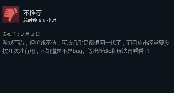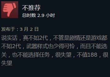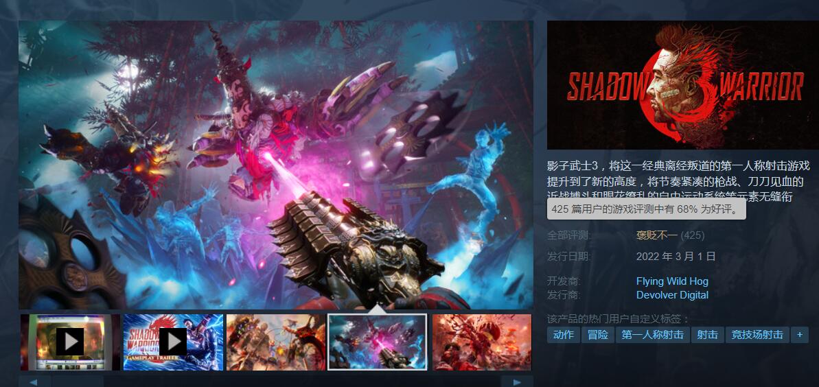 【《影子武士3》Steam评价“褒贬不一”:剧情过短,可玩性相较2代有所较低】《影子武士3》Steam玩家评价现已出炉,游戏目前整体评价为“褒贬不一”,在425篇玩家评价中,好评率为68%。游戏爽快的战斗手感和贴地气的中文翻译获得了不少玩家的好评,而差评方面的原因主要是玩家认为3代游戏的剧情过短,相较2代而言,可玩性较低了不少。