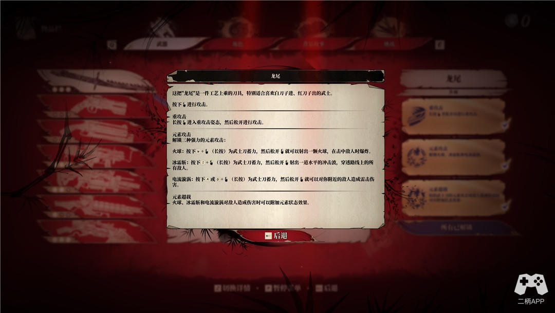第一把武器,也是唯一一把基础近战武器——龙尾。左键轻砍,1觉蓄力,二觉属性伤害,三觉附带debuff。武士刀砍人是会很爽,但是在高难度甚至低难度下,你都会发现敌人近战的伤害相当之高,所以无脑去砍是本作的大忌。如果你是比较喜爱近战的玩家,我推荐把刀加到三觉,冰霜和电击都会让敌人陷入很长时间的僵直,之后就可以爆砍。顺便一提,本作仅有的两个boss用刀都很难解决,尤其是最终boss,基本不可能用到手上这把刀,考虑到资源分配问题,优先给刀加点还是要看个人取舍。