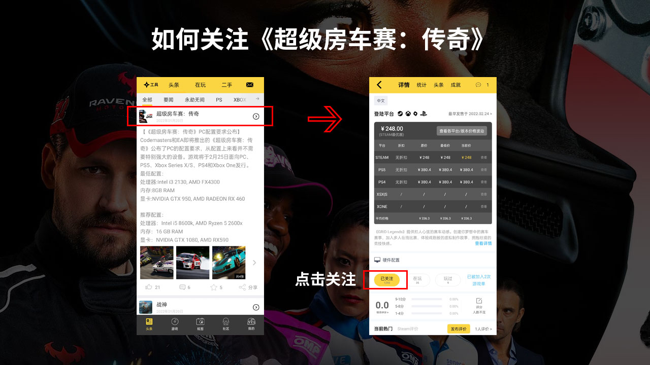 点击右上方进入游戏详情页,在游戏详情页点击“关注”游戏,我们将从此刻~~3月14日0点期间内【新关注】《超级房车赛:传奇》的柄友中,抽出10位柄友各赠送游戏Steam标准版key 1个。