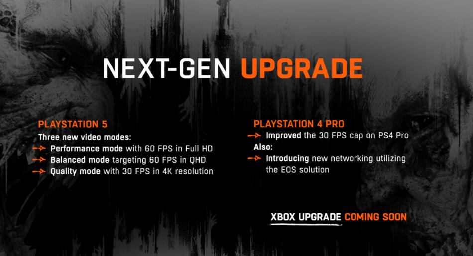 【《消逝的光芒》更新次世代补丁,PS5版支持2K/60帧等三种模式】Techland今日已为《消逝的光芒》PS4 Pro/PS5版推送了次世代补丁,其中PS5平台共提供三种模式可供选择:“性能模式”下支持1080P/60帧,“平衡模式”下为2K/60帧,“画质模式”下为4K/30帧,此外游戏还将提升25%的视距;PS4 Pro则改进了30帧的画面表现,并利用EOS解决方案提升网络质量。官方表示Xbox平台的次世代更新也会在近日内推送,目前团队仍在致力于《消逝的光芒2》的更新,其中包括修复自游戏发售以来所遇到的一系列BUG等问题。