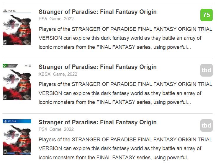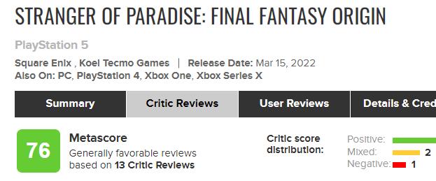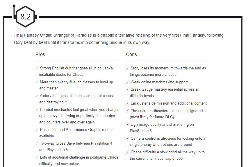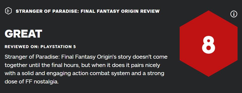 【《最终幻想 起源:天堂的陌生人》评分出炉,IGN 8分】《最终幻想 起源:天堂的陌生人》全球媒体评分出炉,包括有Destructoid 8.5分、Wccftech 8.2分、GamesBeat 8分、IGN 8分、RPG Site 8分、Pushsquare 6分等,Metacritic目前PS5版的媒体平均分为76分(13家媒体),其他版本的评分目前还未更新。