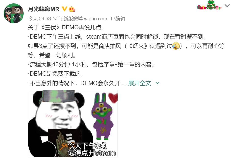 【国产悬疑剧情向解谜游戏《三伏》DEMO流程约40分钟~1小时】拾英工作室主创月光蟑螂MR今日确认,旗下悬疑剧情向解谜游戏《三伏》Steam商店页面与免费试玩DEMO将于今天(3月21日)下午15点上线,DEMO预计为永久开放,流程大概40分钟~1小时,包括序章+第一章的内容。此前月光蟑螂MR表示,相比较《烟火》,《三伏》不再追求恐怖氛围渲染,更看重悬疑的氛围和角色刻画。