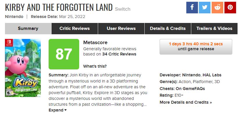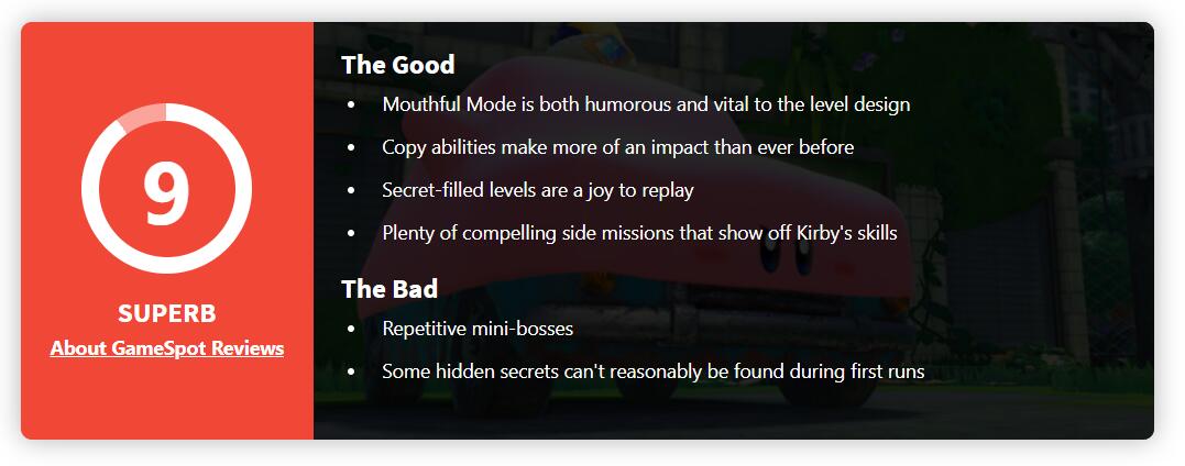 【《星之卡比 探索发现》媒体评分解禁,IGN 8分 GS 9分】 即将于3月25日发售的《星之卡比:探索发现》的媒体评分正在陆续解禁中,目前IGN和GameSpot已公布了各自为本作打出的分数。 IGN给本作打出了8分,认为本作是《星之卡比》向3D化转变的成功之作。GameSpot则给出了9分的高评,盛赞本作是这个老牌系列中最大、最具创造力的作品。并直接冠以“最佳”卡比游戏的美誉。目前游戏在MC上的媒体均分为87分。