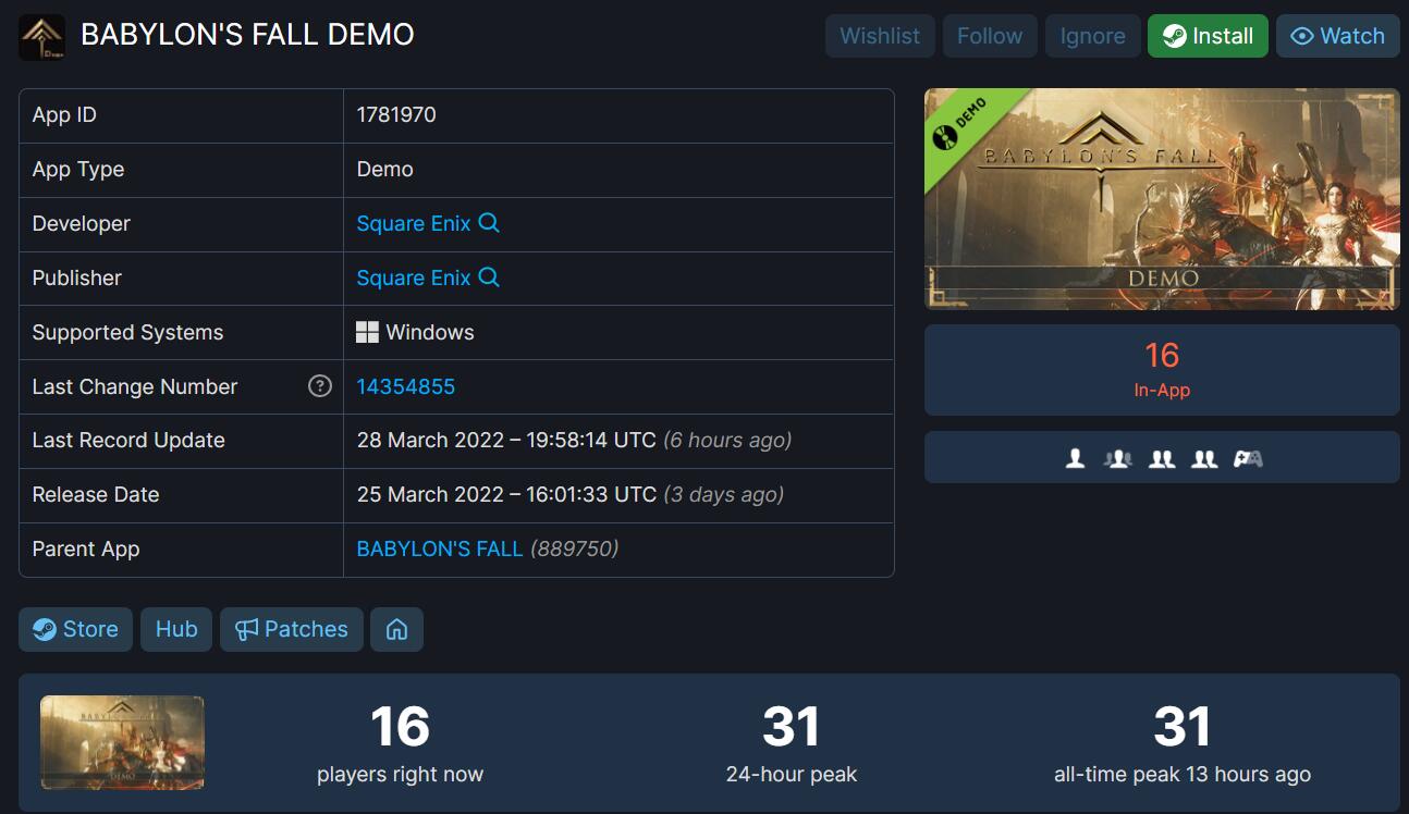 【《巴比伦的陷落》免费试玩版在线峰值仅31人】SE于3月25日在Steam平台推出了《巴比伦的陷落》的免费试玩版,玩家可以体验游戏战役的第一章节部分。不过据Steamdb显示,这款试玩版在线玩家数最多的时候仅有31人……枯燥的玩法以及丧心病狂的收费模式已经使得这款游戏失去了大多数玩家,虽然此前我们报道了白金和SE并没有放弃的打算,但从目前来看现阶段的状况还是比较严峻的。