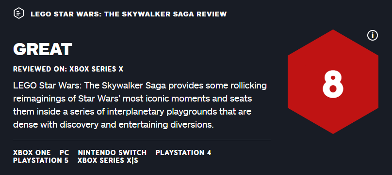 【《乐高星球大战:天行者传奇》获IGN 8分】《乐高星球大战:天行者传奇》已于今日上市,各大媒体评分也相继出炉。目前游戏M站均分83,其中IGN为本作打出了8分的评价。IGN的评测人认为本作将《星球大战》中的经典场面进行了一次有趣的重塑,整个游戏就像一个充满着探索发现元素的星际游乐场。不过其中也有些设定,比如升级和掩护等系统显得有些画蛇添足的意思,并在协力模式中也存在着不少缺点。但除此以外游戏给玩家们带来了十足的惊喜和笑料,在评测时我(测试员)直接从第一章肝到最后,不知不觉就深陷其中,体验过后想探讨的地方可以说远远的多于电影本身。