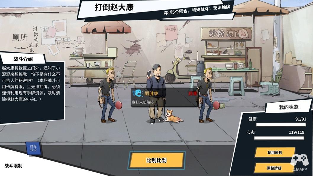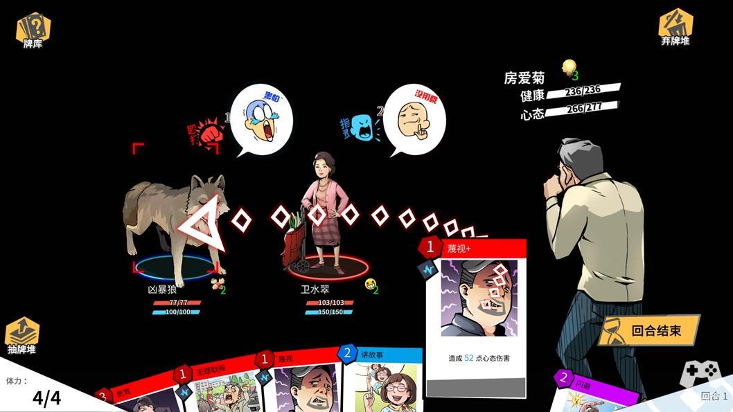 除了单纯的养成和故事外,开发者们还费尽心思在游戏里加入了几个小游戏来增强游戏的可玩度。你能想象这款模拟器里自带了一套完整的卡牌对战游戏?我们可以控制老房组合各式牌组,运用肉体物理攻击或者口头的心理攻势,对战游戏流程中那些不讲道理的坏家伙。为了增强广场舞对决的临场感,他们又为游戏内置了一套音游,让老房在动次打次的节奏里舞动暮年。