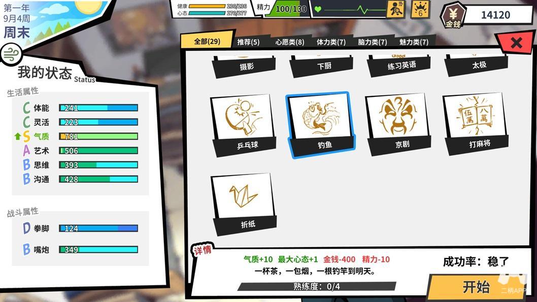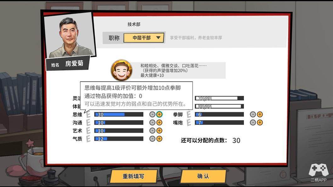 然而就像罗马不是一天建成的,退休生活的安排也非随心所欲。老房前半生作为一介庸才,一身垃圾属性放在网游新手村都会被门口的猪拱死。只能通过日常生活行动的积累去增长他的口才、思维、艺术、体能等等属性来达成强化的目的。
