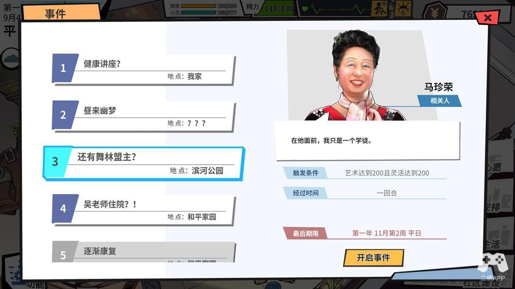不过游戏毕竟还是游戏,故事的背后也要可玩性。于是游戏围绕这些事件设计了一系列的触发、截止、奖励系统。事件的触发需要一定的属性前提,事件发生后又有严格的完成时限,完成它们可以获得高额的成长回报。因此,如何在有限的时间里尽可能达成更多的事件,更多的领略老房人生中的一件件趣事,又是一道摆在我们面前的选择题。