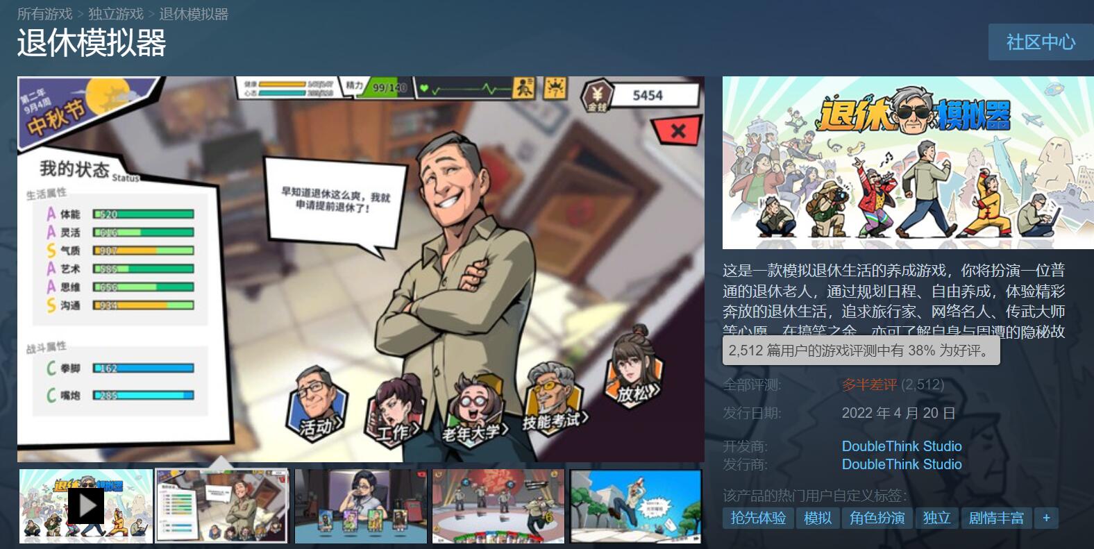 【《退休模拟器》近期更新后游戏评价大跌】由DoubleThink Studio打造的国产模拟经营游戏《退休模拟器》已于日前在Steam上开启了抢先体验。虽然游戏在刚上架时评价还不错,但在官方近期的几次更新之后,大量玩家对于目前游戏内的角色改动感到不满。截至目前,游戏总评已跌至“多半差评”,在总共2472份评测中,仅有38%的玩家给予了好评。