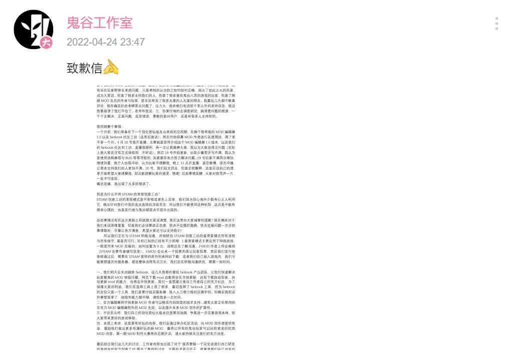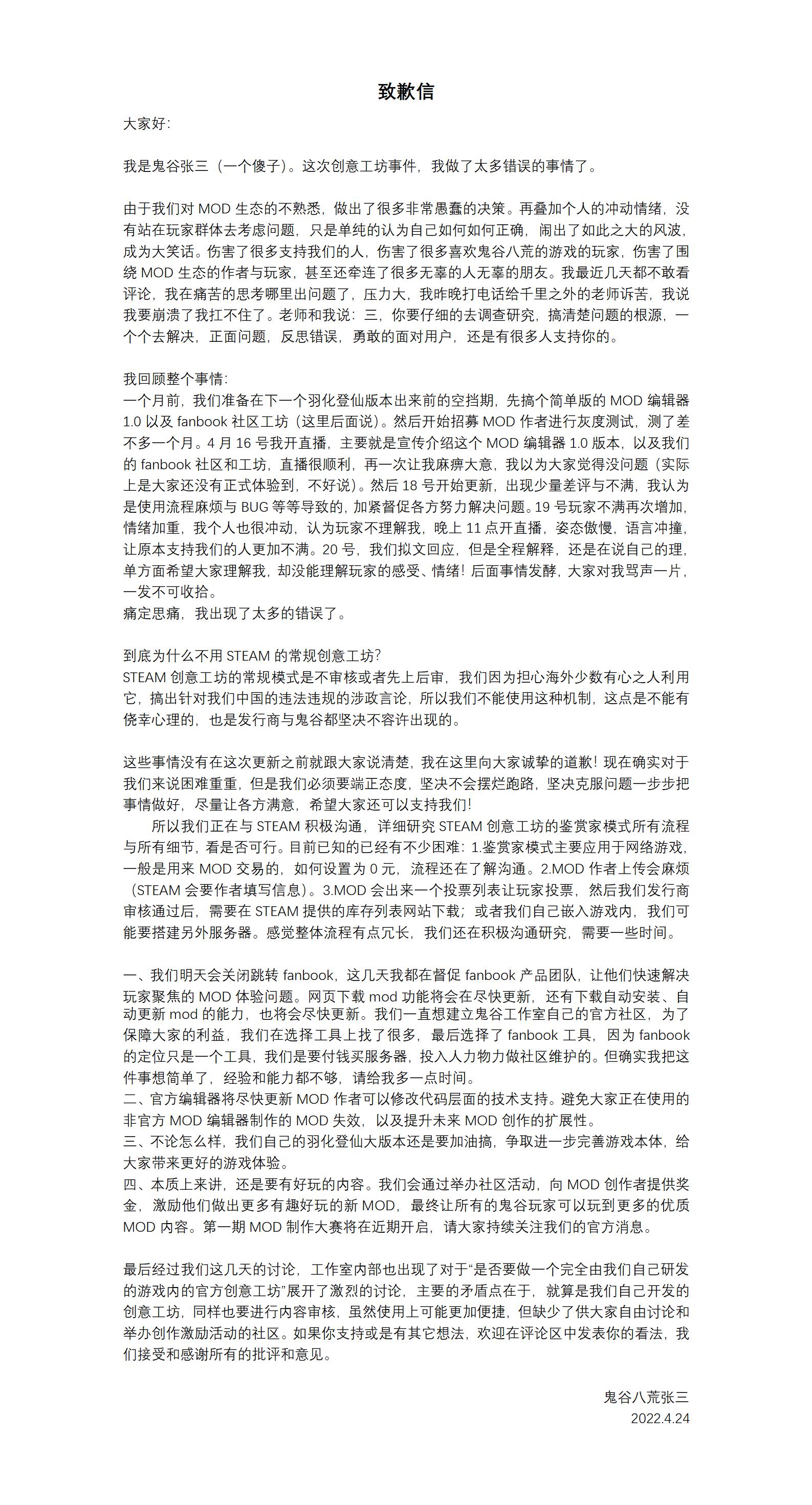 【《鬼谷八荒》制作人发布“致歉信”】近日国产游戏《鬼谷八荒》因选择第三方平台做为官方MOD平台而未选择开启Steam创意工坊,造成与玩家预期差距较大而引发玩家不满 ,昨晚深夜鬼谷工作室制作人张三发布“致歉信”再度回应此事。文章中表示:“由于我们对MOD生态的不熟悉,做出了很多非常愚蠢的决策。再叠加个人的冲动情绪,没有站在玩家群体去考虑问题,只是单纯的认为自己如何如何正确,闹出了如此之大的风波,成为大笑话。伤害了很多支持我们的人,伤害了很多喜欢鬼谷八荒的游戏的玩家,伤害了围绕MOD生态的作者与玩家,甚至还牵连了很多无辜的人无辜的朋友。”致歉信中回顾了事情的始末及回应了官方为何此前不选择Steam创意工坊,表示将会与Steam进行沟通,同时也对现有MOD平台的后续进行了说明。致歉信详情请看下方图片。