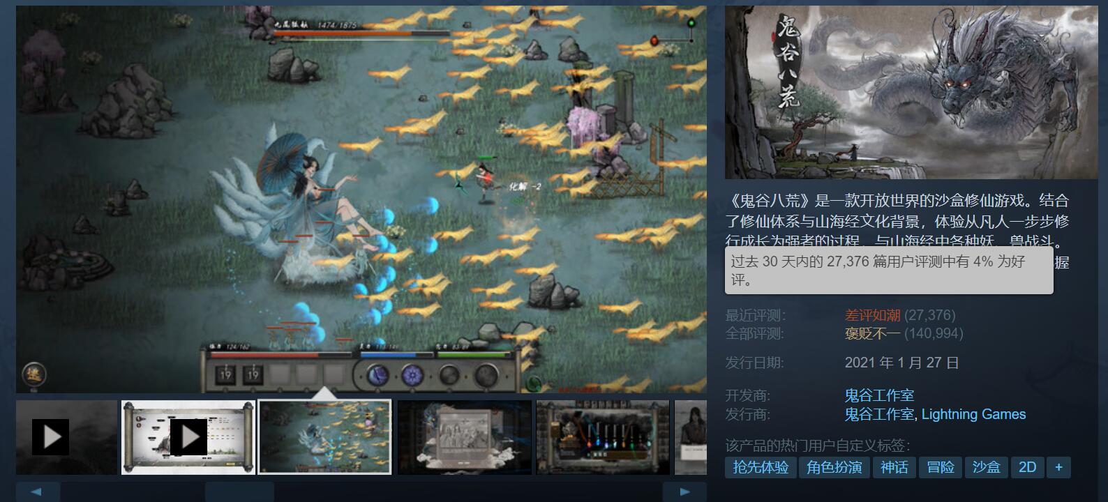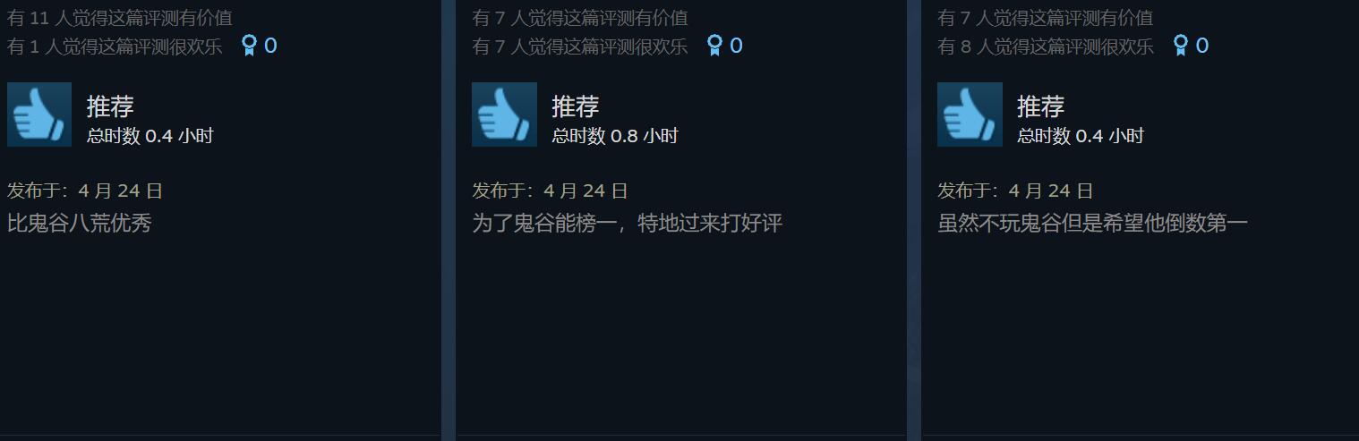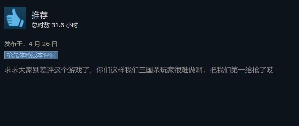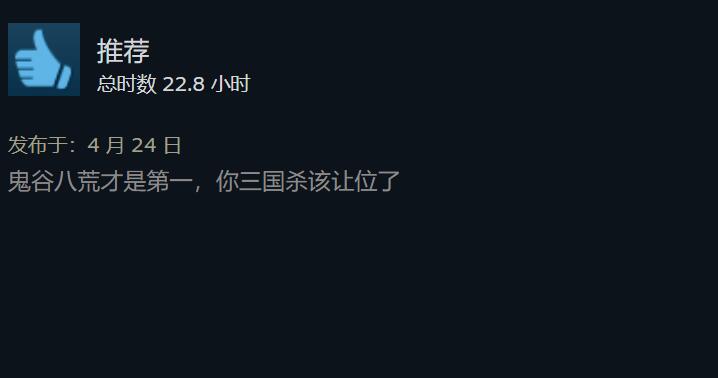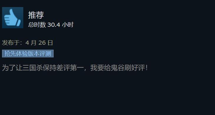 【《鬼谷八荒》与《三国杀》玩家竟开启了争夺差评榜倒第一之战】近日国产游戏《鬼谷八荒》因创意工坊一事的不断发酵,近期游戏在Steam平台迎来了大量的玩家差评,截至目前本作在Steam上的最近评测已跌至“差评如潮”,在近30天内的2万多条评价中仅有4%为好评。而这一情况,似乎引起了位居Steam平台游戏差评榜榜首《三国杀》游戏的玩家关注,并由此出现了非常奇怪的一幕。为了捍卫倒数第一的名号,不少《三国杀》的玩家去《鬼谷八荒》页面中给予了好评,当然另一边的玩家也不示弱故,因此出现了两边玩家相互给对方刷好评的诡异现象。
