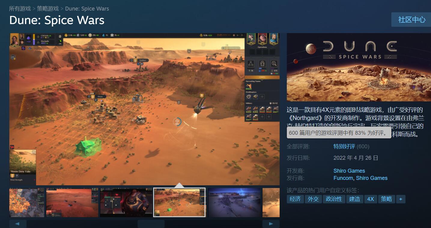 【《沙丘:香料战争》Steam获“特别好评”】由《北境之地》开发商Shiro Games打造的4X即时战略游戏《沙丘:香料战争》已在Steam上正式开启了抢先体验。玩家需要在这个独特的沙丘世界中选择并引领自己的派系,为星球的未来而战。在截至目前已有的600条评测中,83%的玩家给予了游戏好评,整体为“特别好评”。人们普遍认为本作比较偏向经营战略,在现在这类游戏比较匮乏的环境下喜欢4X游戏的玩家还是非常值得一试的;不过游戏节奏略慢,若是仅仅当作是RTS来玩的话还是需要考虑下是否适合自己,并且现在处于EA阶段还有不少有待完善的地方。