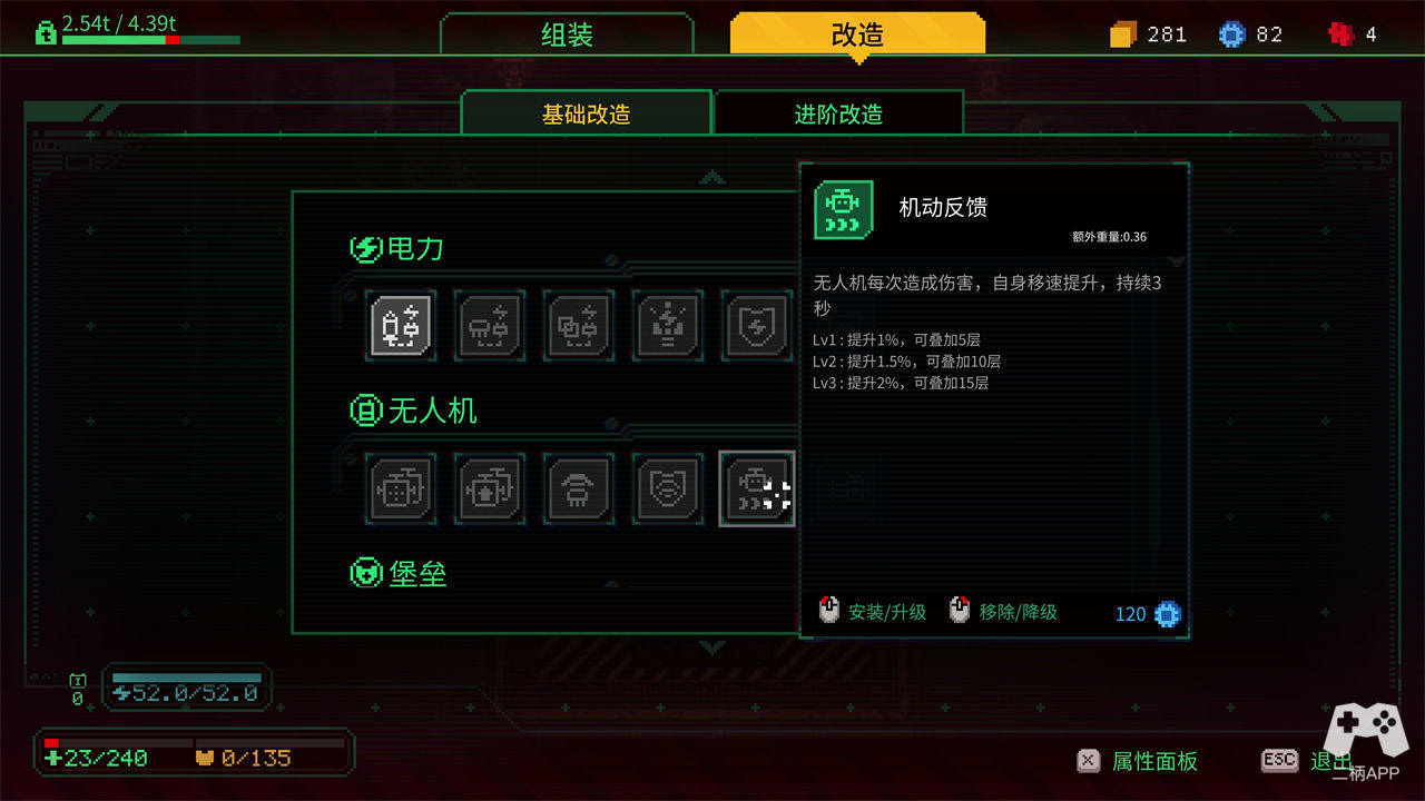 游戏整体打法虽然简洁,但为了在每一个区域的小型团战及每一大关的最终Boss战中存活下来,在装配台区域进行的装备搭配以及机体改造就显得尤为重要。决定玩家“能坚持多久”的两大属性,结构值(HP)及装甲值,分别可以通过装配不同的躯体装备,或是消耗点数提高装甲片来进行强化。玩家在战斗中可以获得的战利品粗略可分为4类,分别是3种不同的点数以及直接的武器或装备奖励。这三种不同点数分别是可以用来在特定的装备出售区购买装备或提高装甲值的黄色点数,进行改造所需要的蓝色点数,以及在最初始的地点进行不会因死亡而清空的永久性加强的红色点数。改造环节同样被设定的很细致,总体分为基础改造和进阶改造两部分,基础改造又根据作用不同分为6大体系,每个体系又细分成多种特定的提升,需要玩家根据自己的打法认真抉择;进阶改造则相对随机,玩家通过消耗点数抽取4个额外技能,并自行选择是否搭载。游戏里的负重设定更是让玩家不得不精打细算,所有的装备以及基础改造都会占用一定的承重空间,这让如何搭配它们成为了一个贯穿游戏始终的课题。
