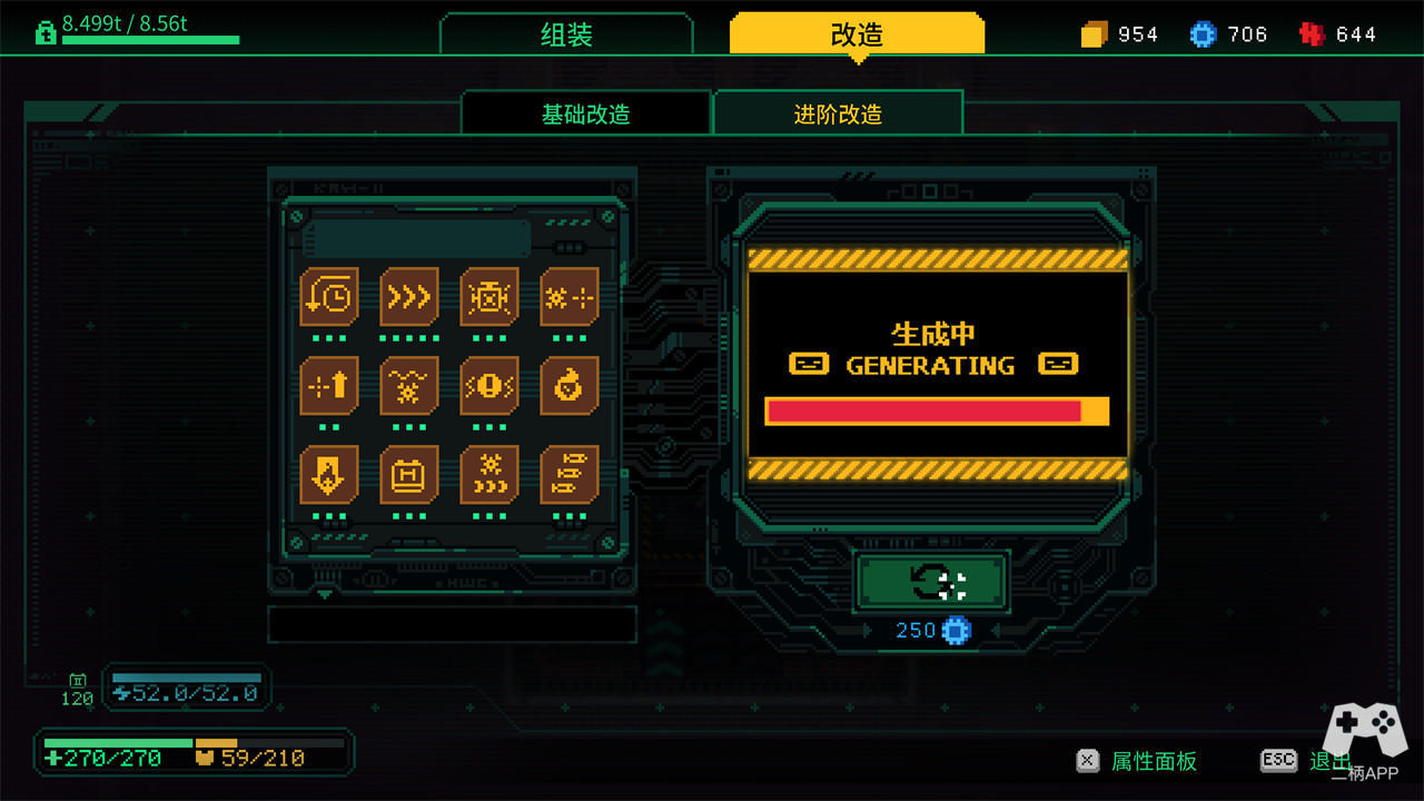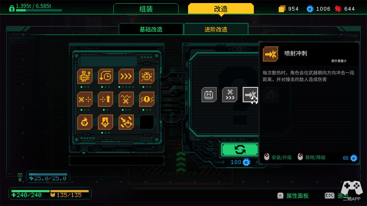 游戏对打法的指向如此明确,技能加点部分其实就变的很好理解。按图索骥,水到渠成,无视掉对你打法不利,只选择可以让自己打得更顺的技能即可。基础改造部分的6大项均为固定选项,而进阶改造则是随机抽取,不过后者的好处在于只消耗货币,不会占用负重,只要余额充足,可以尽情抽奖。