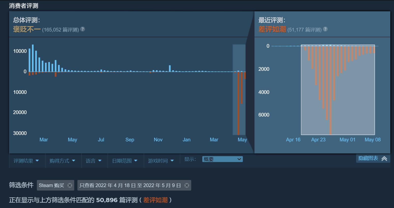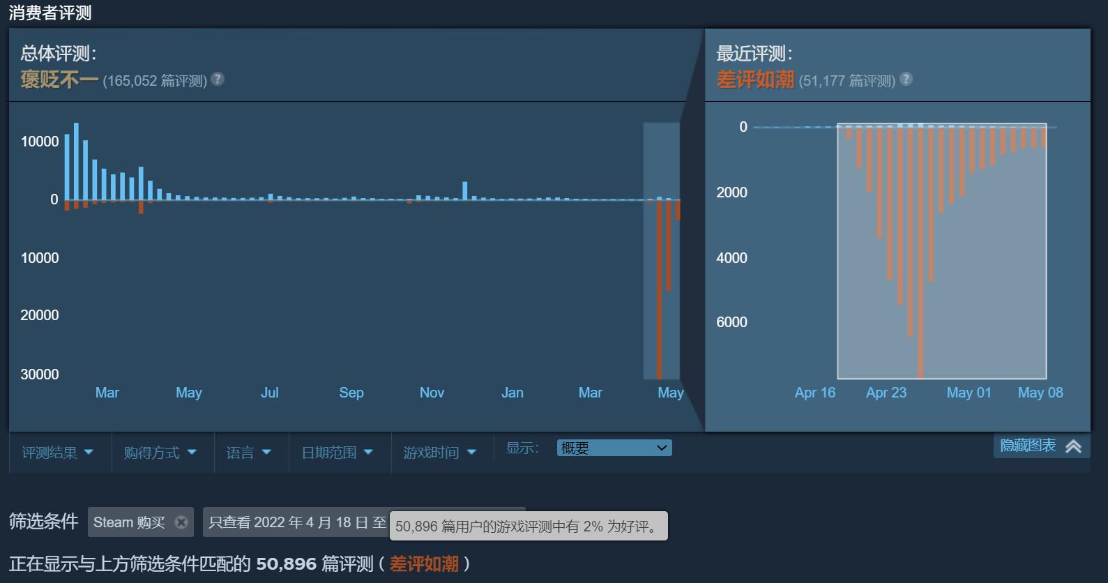 【《鬼谷八荒》自MOD制作工具上线以来,更新20天后获将近4.9万的玩家差评】此前国产游戏《鬼谷八荒》因选择第三方平台做为官方MOD平台而未选择开启Steam创意工坊,造成与玩家预期差距较大而引发玩家不满。今日根据游戏的Steam页面显示,自从于4月18日上线该功能以来,截止至目前(2022年4月18日至2022年5月9日)收到的50,896篇玩家评价中,仅有2%的好评,也就是有将近4.9万的玩家差评。