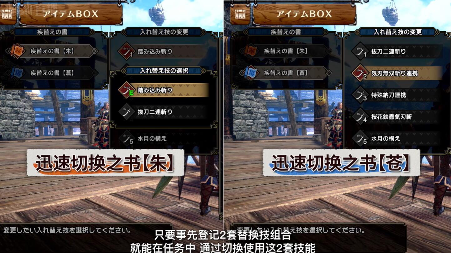 4.迅速切换,玩家可以事先登录2套替换技组合在狩猎中瞬间切换,连出更多帅气的动作。