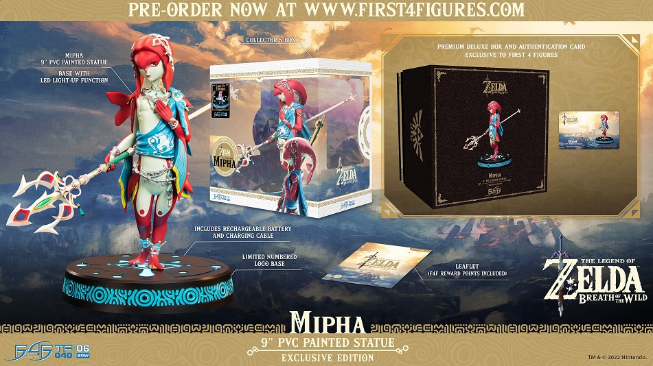 【 First 4 Figures推出《塞尔达传说:旷野之息》米法限定手办 】 First 4 Figures今日公布了《塞尔达传说:旷野之息》米法的限定手办。在造型上本次采用了可以尽显米法温柔的站姿,一手轻按在胸前,另一只手持着光鳞之枪,而底座则是使用了可以发光的led设计。产品高约22.5CM,除了华丽的包装盒外,还附带产品的认证卡和限量版编号。手办售价124.99美元,现已开启预约,预计2022年第四季度发货。